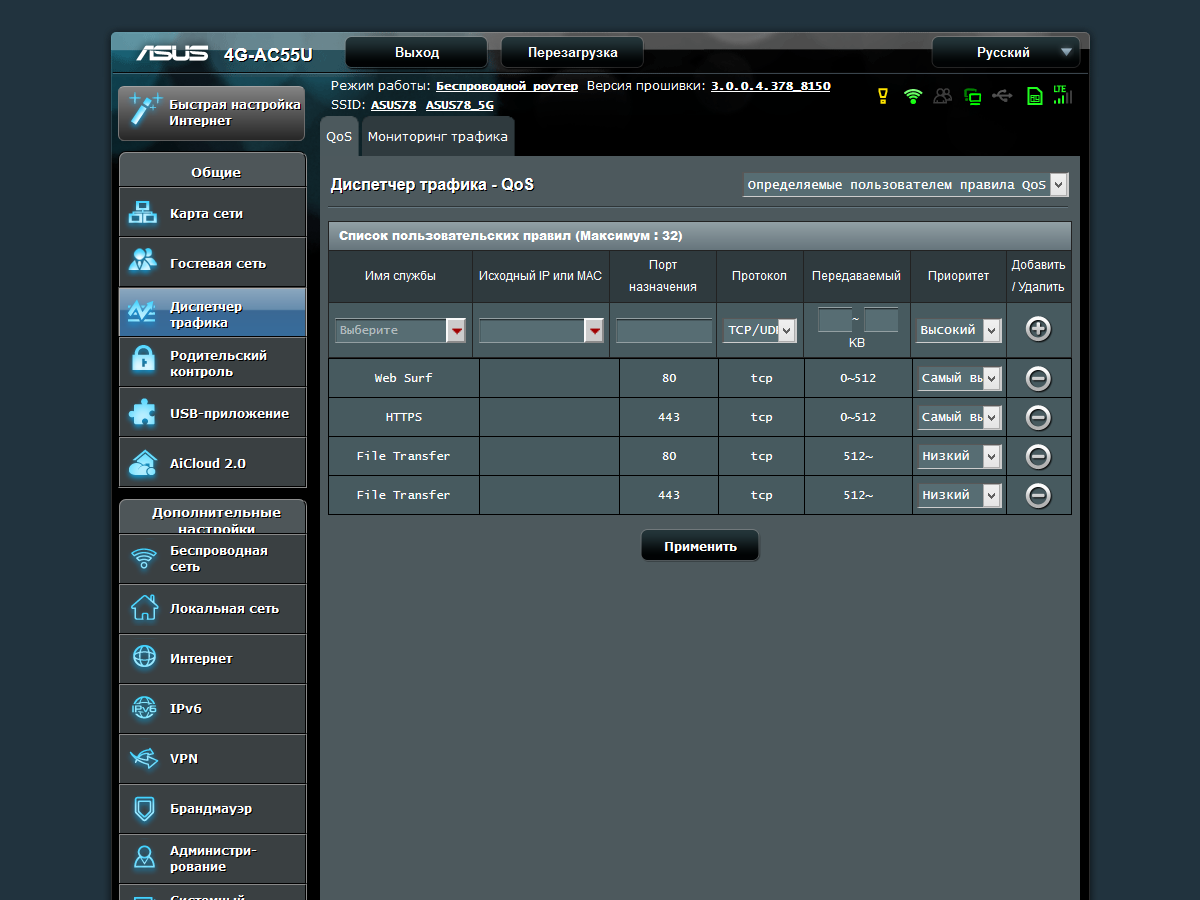 Роутер имеет систему управления трафиком, которая поддерживает два режима работы — указание клиентам локальной сети ограничений скоростей на прием и передачу данных из интернета или настройку правил с приоритетами для трафика определенных типов.