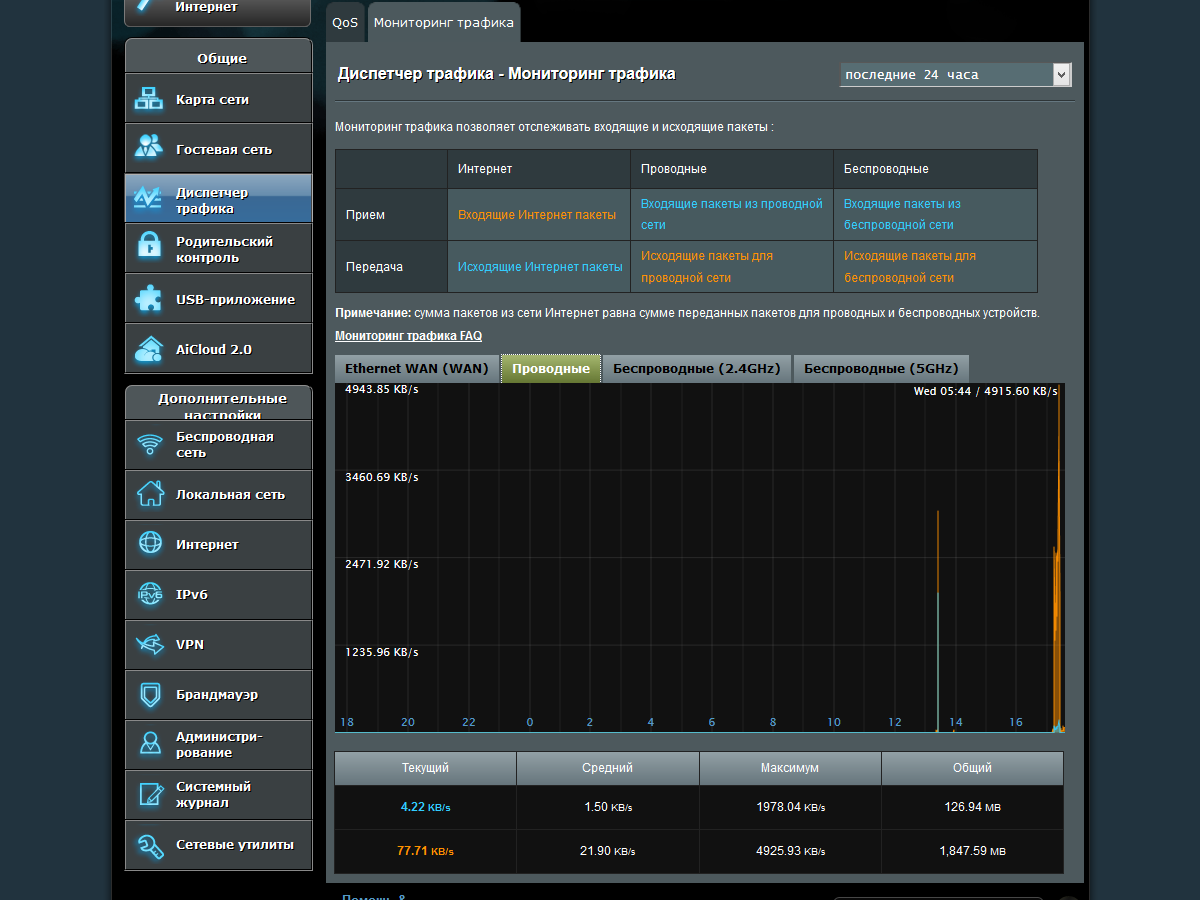 На отдельной странице вы можете следить за текущими скоростями для каждого интерфейса, оценить нагрузку за последние сутки или узнать статистику объемов приема и передачи данных.