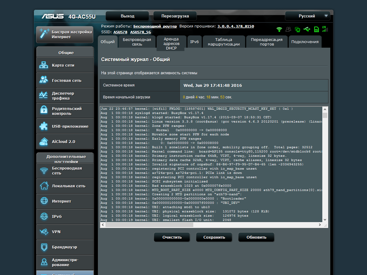 Роутер ведет внутренний журнал системных событий, для отправки информации на другие устройства предусмотрена поддержка протокола syslog. Также в веб-интерфейсе доступны таблицы подключенных беспроводных клиентов (с указанием скоростей и длительности соединения), аренды адресов DHCP, маршрутов, трансляций портов и текущих подключений.