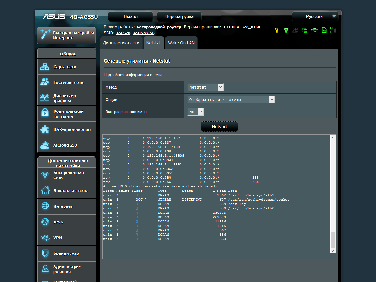 Для диагностики соединений в случае проблем будут полезны встроенные сетевые утилиты ping, traceroute, nslookup и netstat. В этом же разделе находятся настройки функции WOL, которая может применяться для удаленного включение питания оборудования.