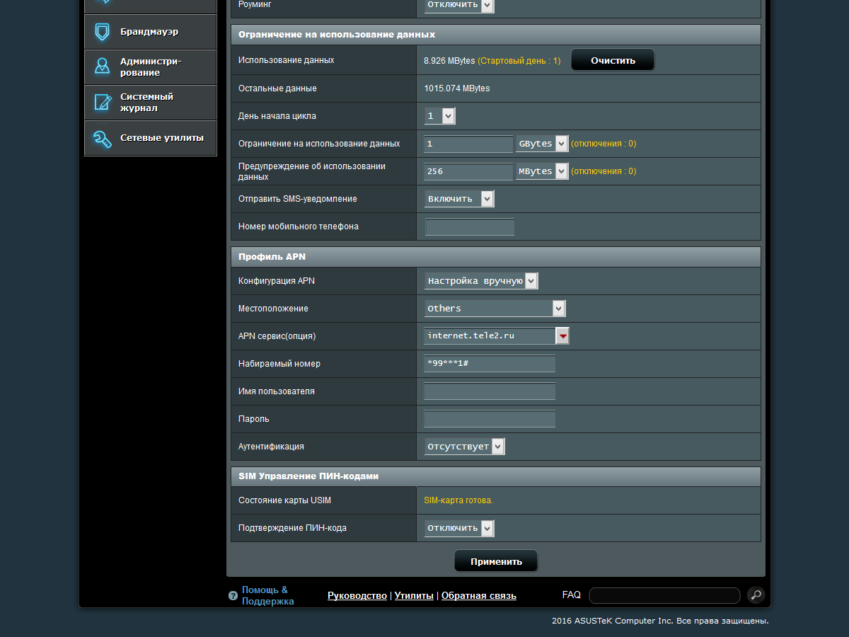 Для использования сотового модема вам потребуется установить SIM-карту оператора и проверить соответствие настроек роутера его требованиям. На странице «Интернет-Подключение-Мобильная сеть» представлено несколько опций. В частности здесь можно отключить этот интерфейс, если он не требуется, проверить версию ПО модема и его IMEI, выбрать режим сети (2G, 3G, 4G или 3G/4G) и диапазон для LTE, разрешить роуминг. Также представлены настройки APN, а также управление PIN-кодом SIM-карты.