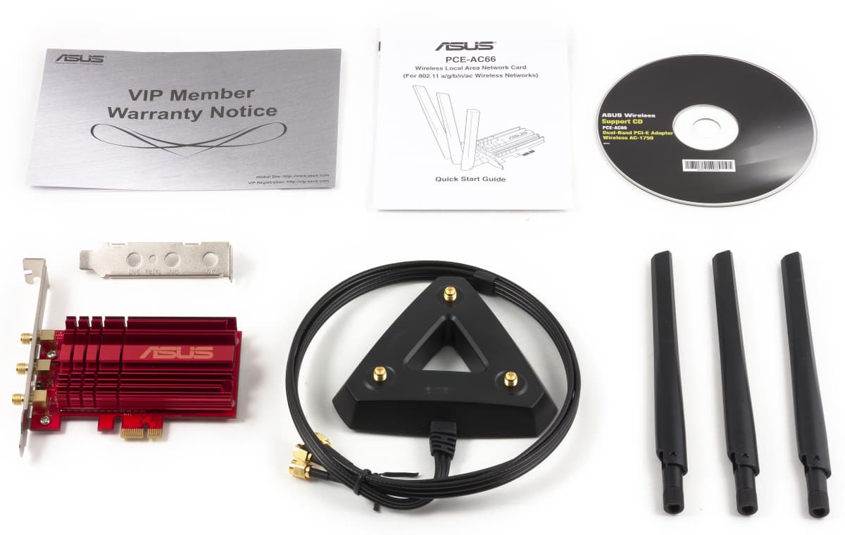 В комплекте с адаптером идут три крупные двухдиапазонные антенны, внешний блок для них, сменная планка для установки в низкопрофильные корпуса, листовка, компакт-диск с драйвером, утилитой настройки и электронной версией листовки, а также гарантийный талон.