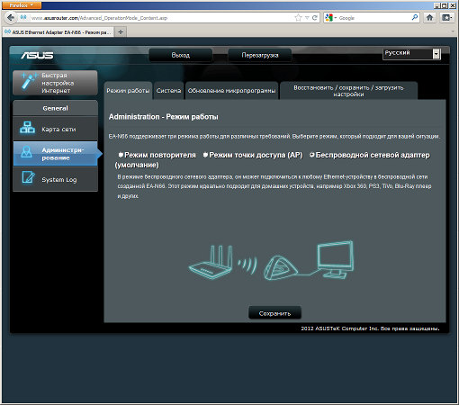 Как многие аналогичные модели, ASUS EA-N66 очень легко подключить в качестве клиента к бытовой технике без настройки на ПК. Достаточно использовать технологию WPS на вашем беспроводном роутере. В этом случае устройство работает в режиме Ethernet-адаптера, обеспечивая подключение к беспроводной сети одного или нескольких (при добавлении сетевого коммутатора) устройств. Но этим варианты использования не ограничиваются. Кроме сетевого моста, устройство может выступать в ролях беспроводной точки доступа и повторителя. Настройка в этом случае осуществляется через web-интерфейс. Для доступа к нему необходимо использовать адрес http://www.asusnetwork.net или http://www.asusrouter.com в браузере на подключенном к устройству компьютере.