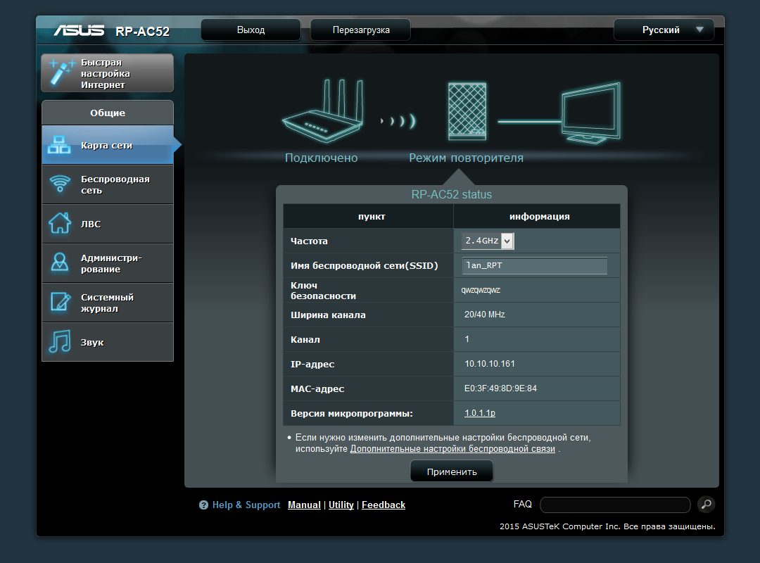 Слева мы видим кнопку запуска помощника настройки и шесть основных пунктов меню. «Карта сети» позволяет оперативно проверить текущие подключения повторителя, правда надо еще догадаться, что для уточнения статуса соединения с основным роутером нужно щелкнуть мышкой на его картинке. К сожалению, уровень сигнала этого соединения не показывается в интерфейсе. Но при выборе места установки повторителя можно ориентироваться на его собственные индикаторы.