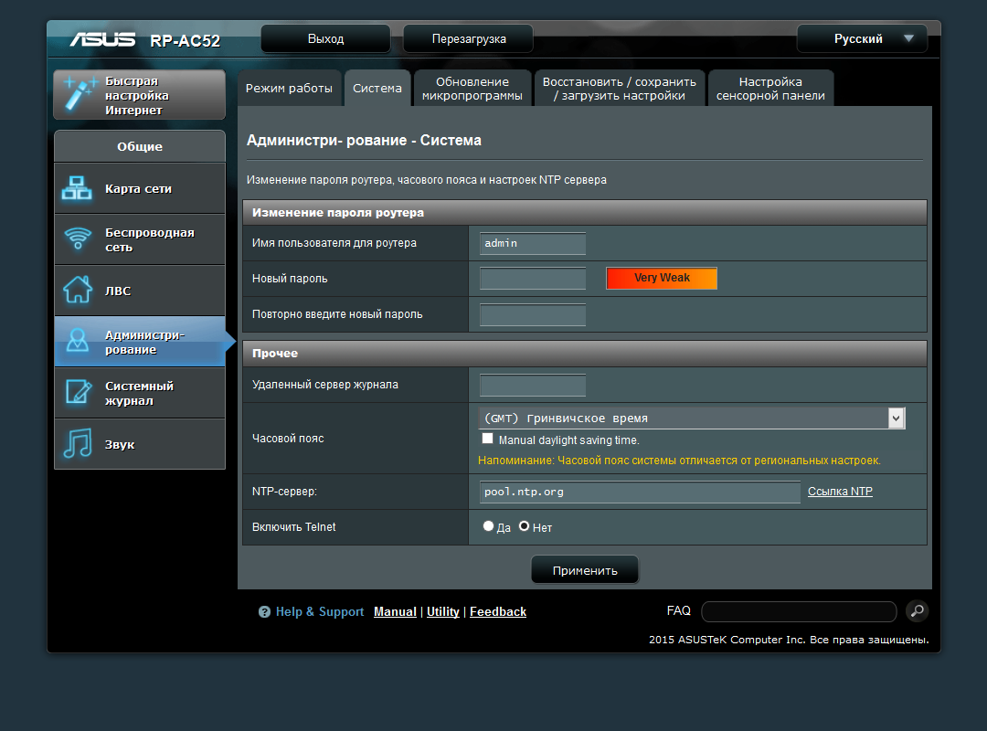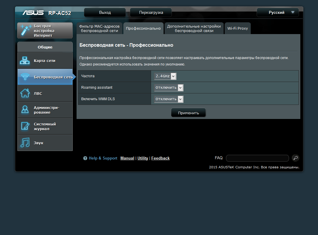 Веб-интерфейс настройки устройства имеет знакомый по роутерам Asus дизайн. В верхней части окна находятся кнопки выхода и перезагрузки, а также пункт выбора языка (русский в списке присутствует).