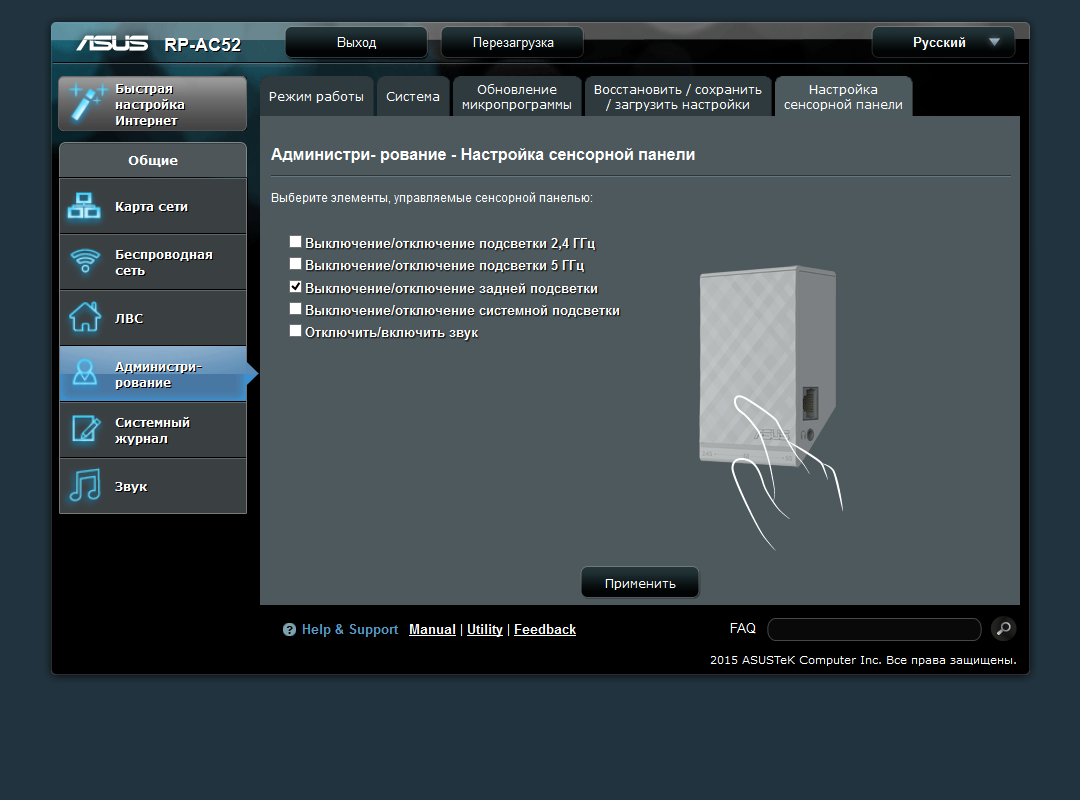 Стандартный для роутеров раздел «Администрирование» есть и в этом устройстве. Кроме привычных пунктов изменения пароля, работы с конфигурацией и обновления прошивки здесь есть выбор режима работы и выбор действия при касании сенсорной панели. Можно использовать сразу несколько пунктов для контроля работы индикаторов, включения светодиода ночника, отключения звука. Заметим, что производитель сохранил и возможность доступа к консоли устройства по протоколу telnet, хотя при отсутствии порта USB это не имеет большого значения.