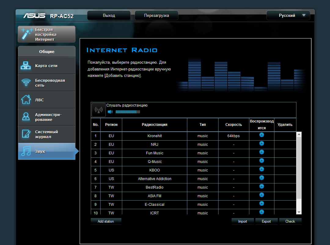 Как и предшественник, повторитель RP-AC52 оборудован стандартным миниджеком 3,5 мм для вывода аналогового стереозвука. Первый вариант его использования — прослушивание интернет-радиостанций. Эта функция управляется через веб-интерфейс роутера, что не очень удобно. Предусмотрено обновление списка с серверов Asus и добавление собственных ссылок на http-потоки. Для регулировки громкости есть специальный слайдер.
