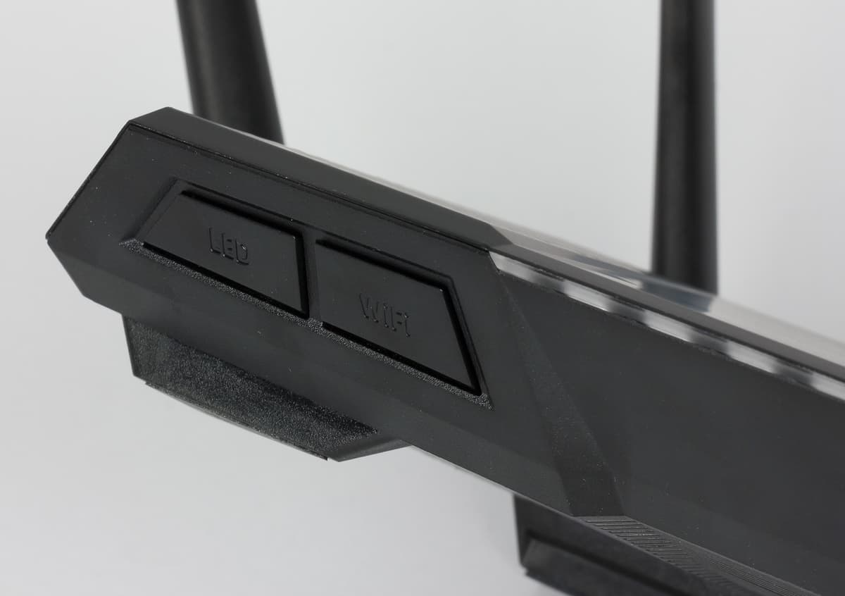 На переднем ребре находятся набор светодиодных индикаторов белого свечения (статус и сеть 5 ГГц дополнительно имеют второй цвет). Слева «под навесом» установлены две крупные кнопки для управления подсветкой и беспроводными точками доступа.