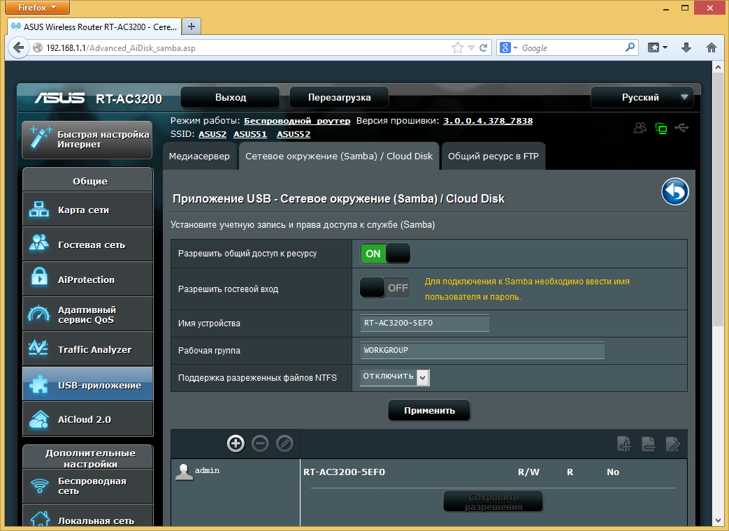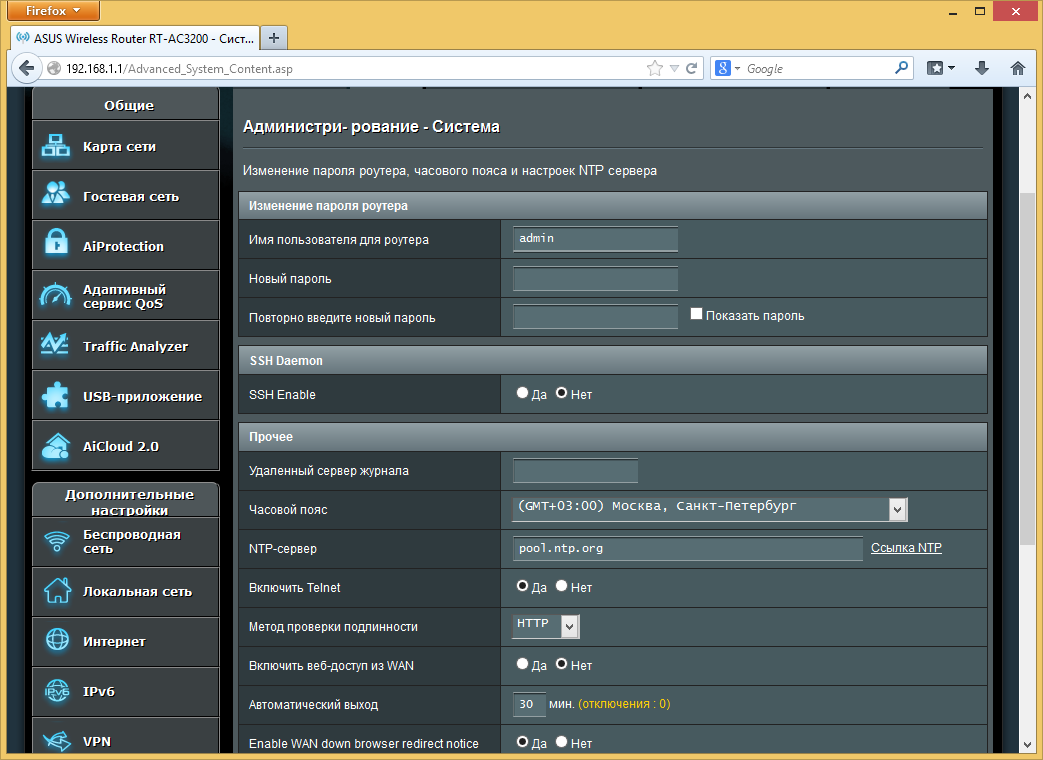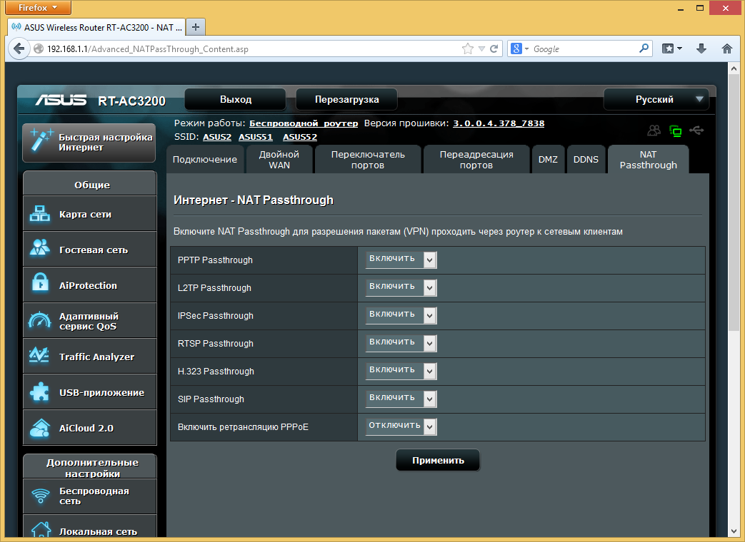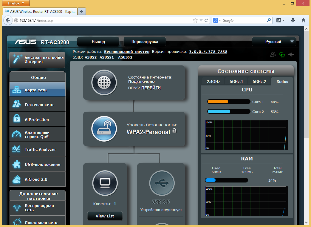 Прошивка рассматриваемого роутера очень похожа на ранее виденные версии AsusWRT в моделях этого производителя. Напомним, что присутствует и качественный русский перевод веб-интерфейса. Отличия заключаются в основном в специфических для данной аппаратной конфигурации функциях, а также нескольких дополнительных сервисов, реализовать которые позволила мощная платформа устройства.