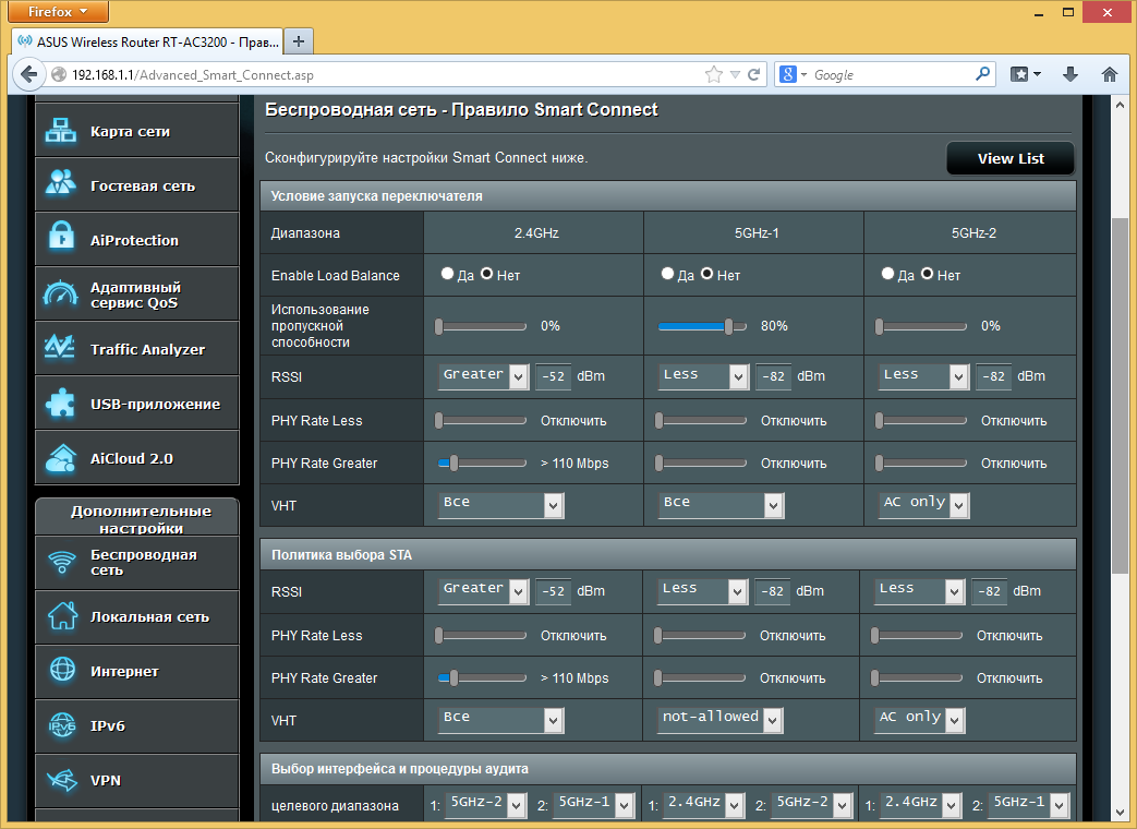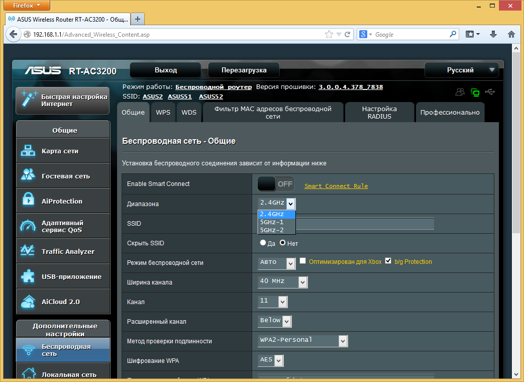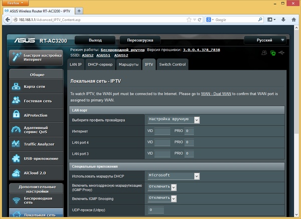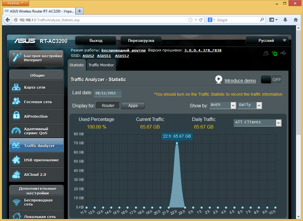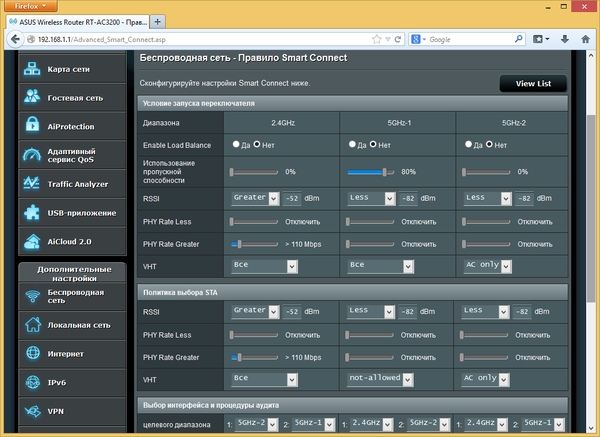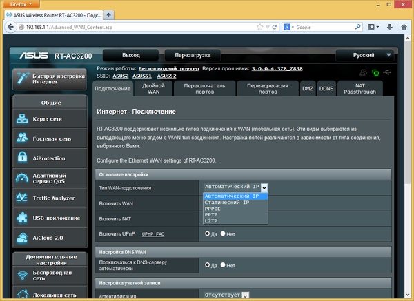 Прошивка рассматриваемого роутера очень похожа на ранее виденные версии AsusWRT в моделях этого производителя. Напомним, что присутствует и качественный русский перевод веб-интерфейса. Отличия заключаются в основном в специфических для данной аппаратной конфигурации функциях, а также нескольких дополнительных сервисов, реализовать которые позволила мощная платформа устройства.