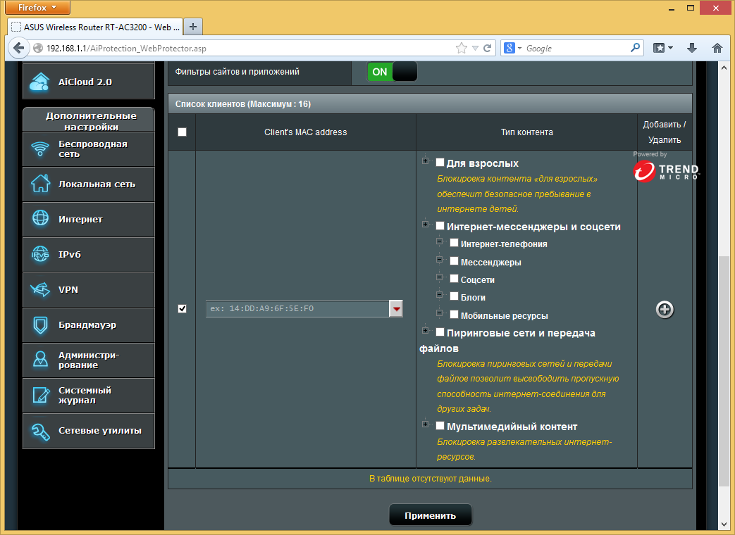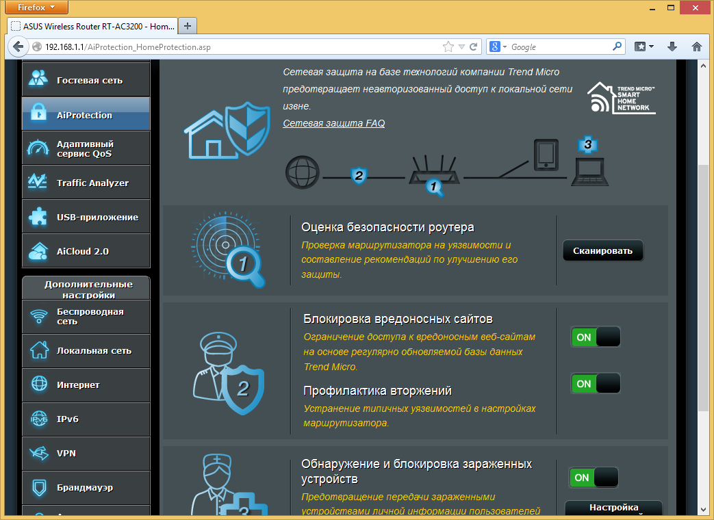 Дополнительно в рассматриваемом роутере используются технологии компании Trend Micro для повышения безопасности вашей сети. Предусмотрена проверка настроек роутера (например, сложности паролей), блокировка вредоносных сайтов на основании обновляемой базы данных компании, а также обнаружение и блокировка зараженных локальных систем. В этом сервисе есть возможность отправки уведомлений администратору по электронной почте.