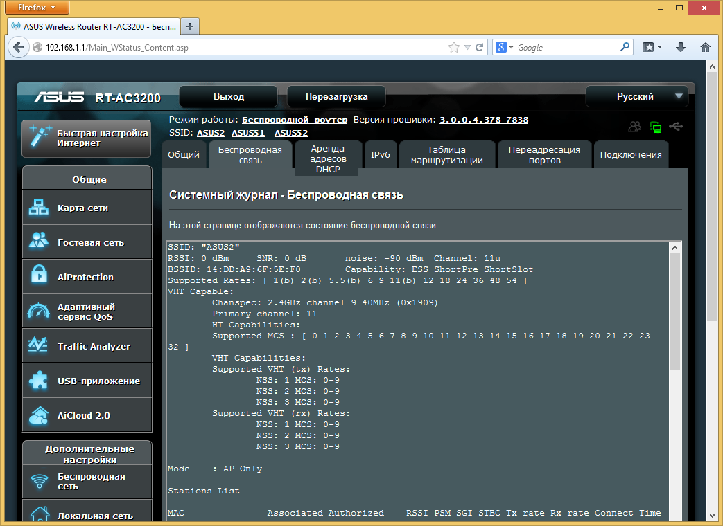 Традиционно роутеры Asus имеют расширенные возможности системного журнала. Кроме привычного списка событий, здесь есть страницы с информацией о беспроводных клиентах, выданных адресах DHCP, IPv6, таблица маршрутизации, список трансляции портов и таблица сетевых подключений. Поддерживается отправка записей журнала на внешний сервер syslog.