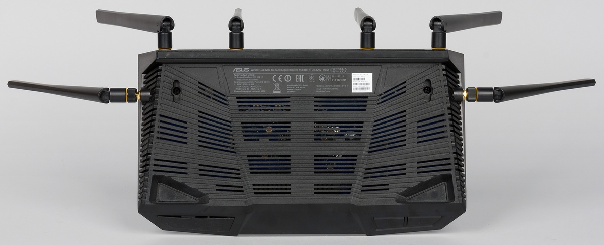 Роутер имеет крупный корпус и оборудован сразу шестью антеннами. В данной модели используется популярная аппаратная платформа Broadcom верхнего сегмента. Традиционно мы видим гигабитные сетевые порты, а также USB 2.0 и USB 3.0. Заявленные «три диапазона Wi-Fi» называть так, пожалуй, не очень корректно, поскольку «третий» на самом деле является просто верхними каналами для 5 ГГц. Однако это позволило производителю указать красивую цифру в названии и спецификациях (600+1300+1300=3200). Мы уже тестировали много моделей с поддержкой 802.11ac и видели, что максимальная реальная скорость в многопоточном режиме может достигать впечатляющих значений в несколько сотен мегабит в секунду, достаточно близко подбираясь к гигабитной проводной сети. Наличие двух радиоблоков на 5 ГГц, работающих на разных и непересекающихся наборах каналов, теоретически может позволить повысить общую производительность беспроводной сети, но здесь есть несколько особенностей. Во-первых, для обеспечения гарантированной высокой скорости лучше использовать проводное подключение, так что ситуация, когда от роутера требуются высокие скорости для нескольких клиентов с топовыми беспроводными адаптерами все-таки сложно. Во-вторых, два 802.11ac по суммарной скорости могут ограничиваться уже гигабитными проводными портами. Так что определенные вопросы использованная конфигурация вызывает. Попробуем разобраться с ними в этом тестировании.
