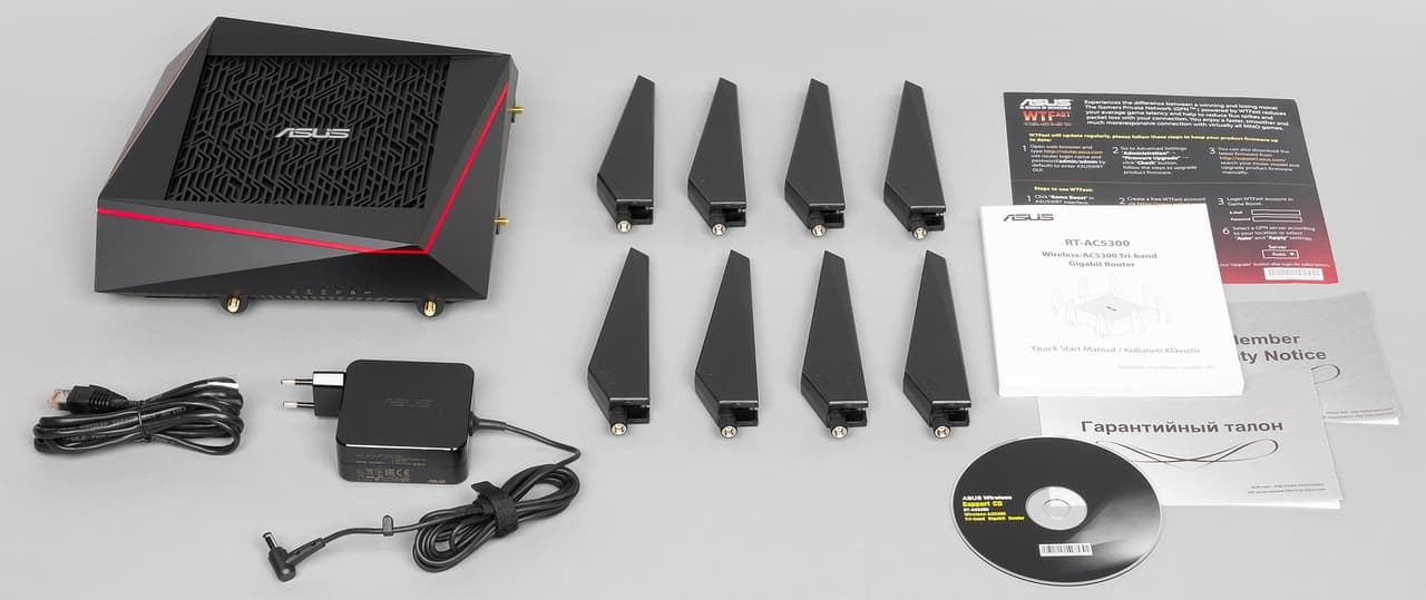 Внутри на нескольких уровнях в специальных картонных вставках находятся сам роутер, восемь антенн, блок питания (19 В, 3,42 А, 65 Вт), один сетевой патч-корд, комплект документации, гарантийный талон, компакт диск с программным обеспечением. Жаль, что и это можно считать скорее минимально-достаточным вариантом, чем версией для продукта верхнего сегмента. Вполне можно было бы добавить какой-нибудь двухдиапазонный беспроводной адаптер или еще что-нибудь полезное.