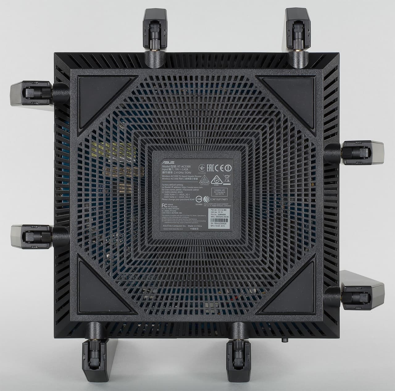 Впрочем, расширенные возможности беспроводных подключений — не единственная интересная сторона устройства. В частности стоит отметить использование мощного двухъядерного процессора, работающего на частоте 1,4 ГГц, портов USB 2.0 и USB 3.0, многофункциональной прошивки AsusWRT с множеством дополнительных сервисов. Однако, на наш взгляд, больше всего привлекает внимание дизайн корпуса устройства с восемью антеннами.