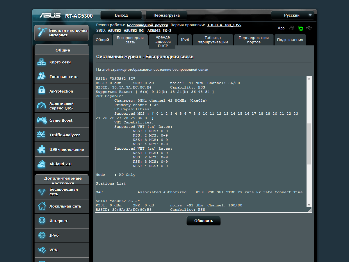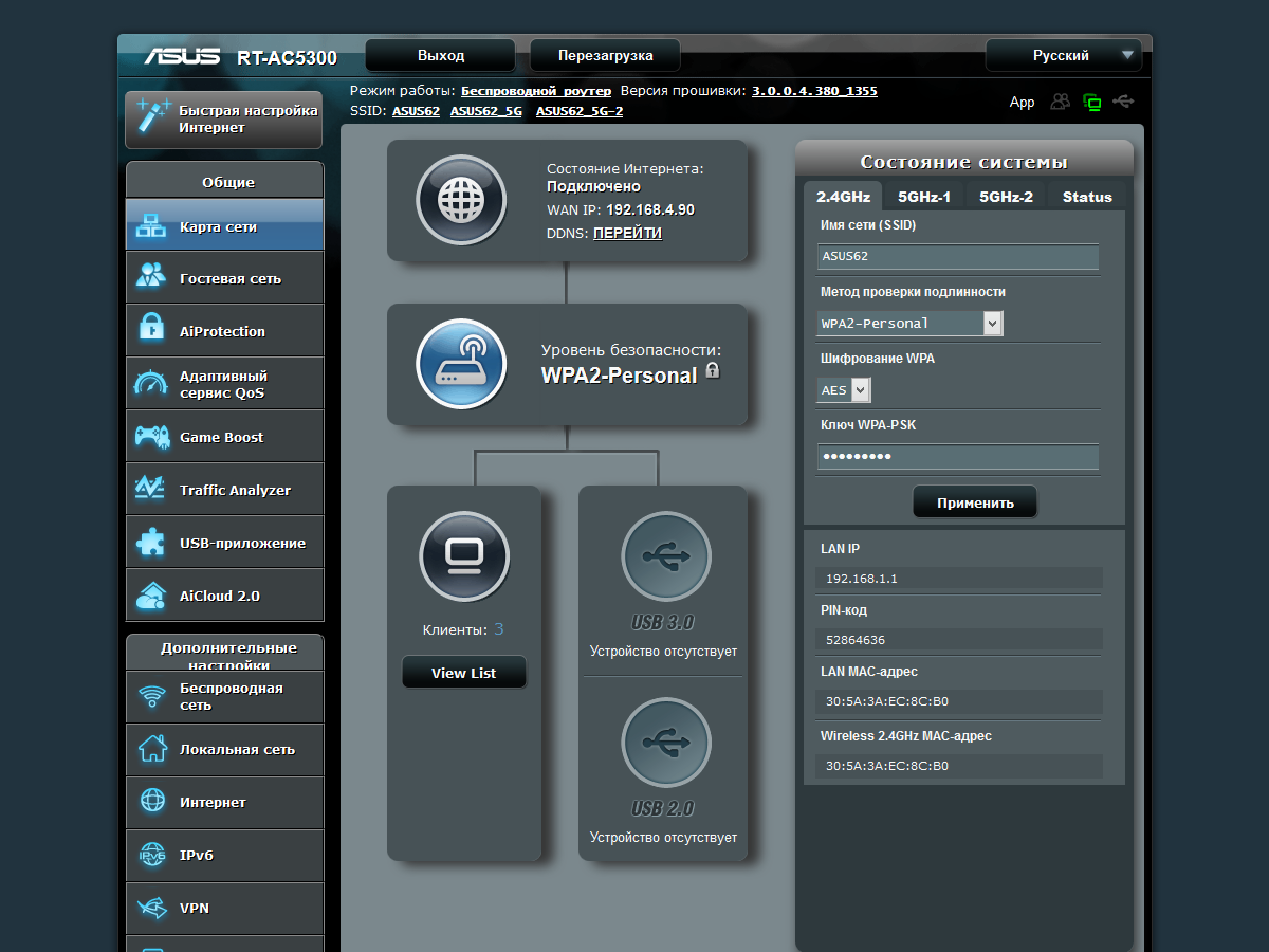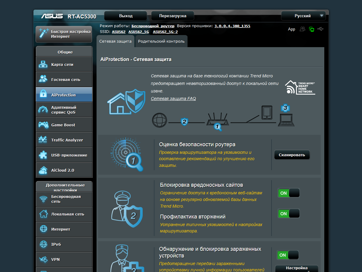 С точки зрения возможностей встроенного программного обеспечения, RT-AC5300 практически не отличается от ранее рассмотренных моделей Asus верхнего сегмента.