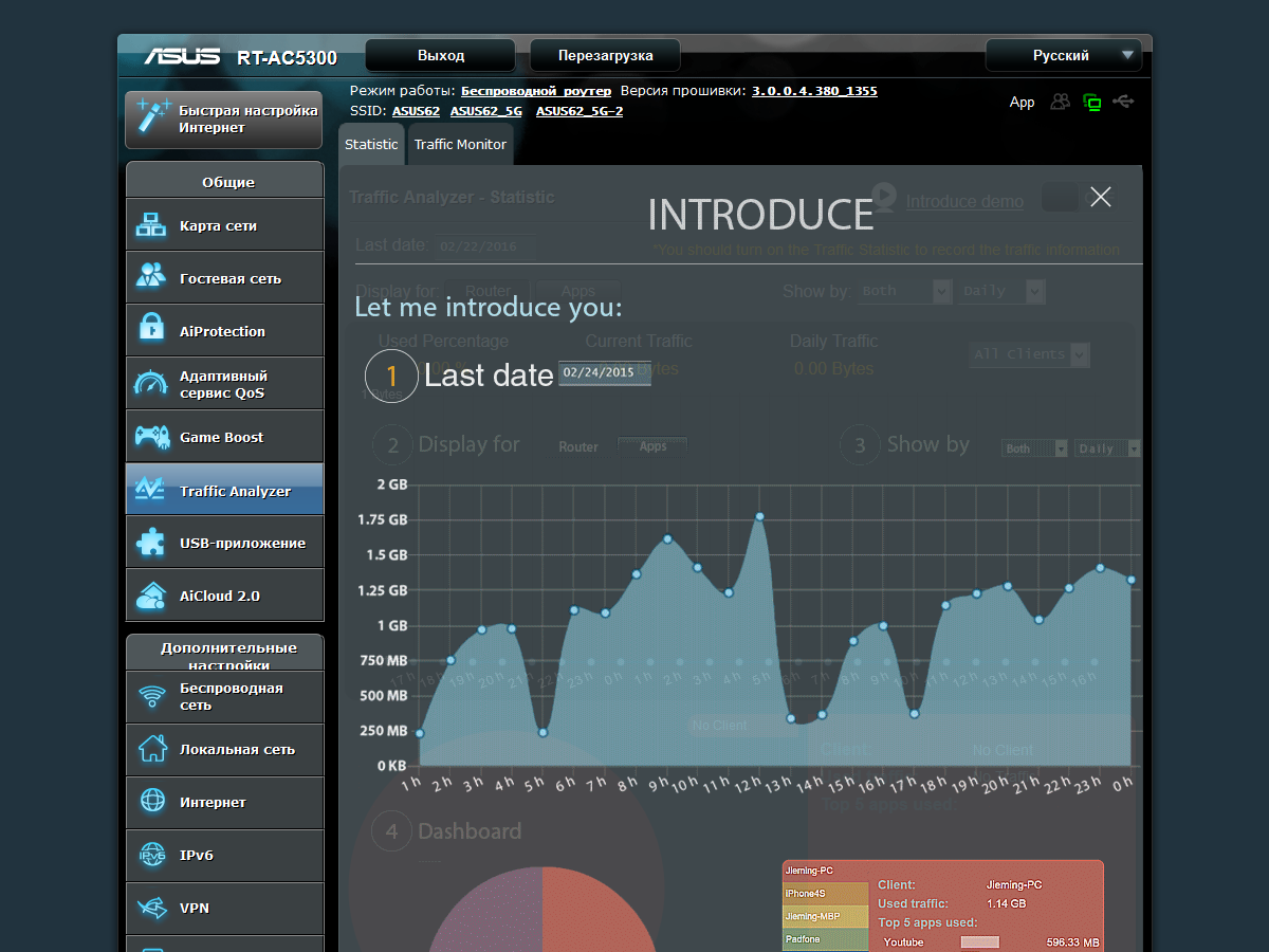 Про решения групп «Game Boost» и «Адаптивный сервис QoS» мы упоминали в прошлой статье и на наш взгляд они носят скорее маркетинговый характер. А вот «Traffic Analyzer» может оказаться полезным для контроля текущей нагрузки на устройство, а также определения «прожорливости» клиентов.