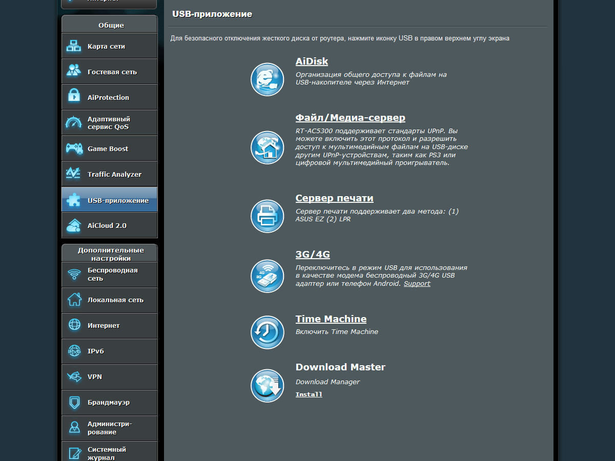 Наличие портов USB позволило реализовать несколько дополнительных функций, включая обслуживание накопителей и принтеров. Пользователям компьютеров от Apple будет полезна совместимость с программой резервного копирования Time Machine, встроенной в OS X. Также напомним о возможности автономной загрузки файлов благодаря сервису Download Master и трансляции мультимедиа по протоколу DLNA.