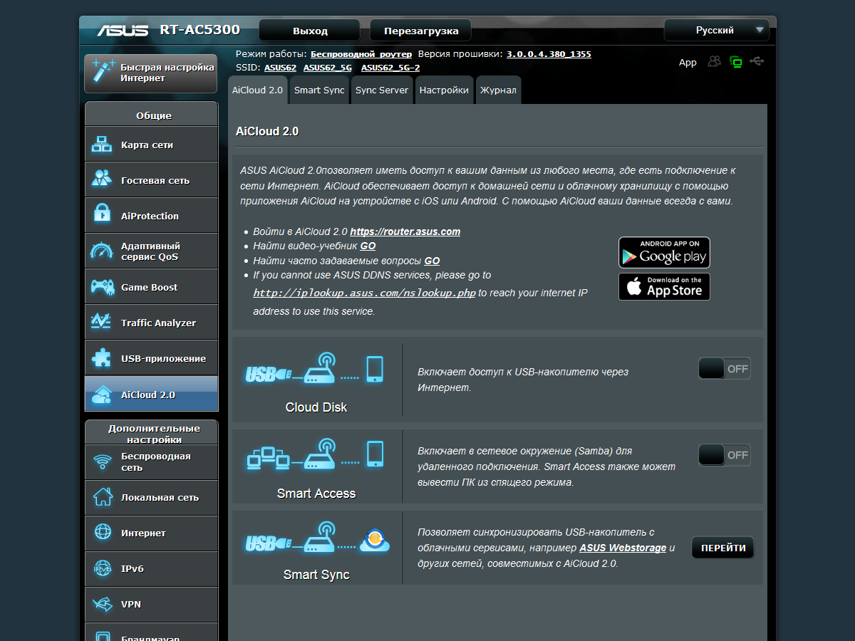 Облачные службы реализованы через знакомые функции AiCloud 2.0. Пользователь может получить удаленный доступ к своим файлам через браузер или утилиту для мобильных устройств, а также выполнить синхронизацию данных с Asus WebStorage или Dropbox.