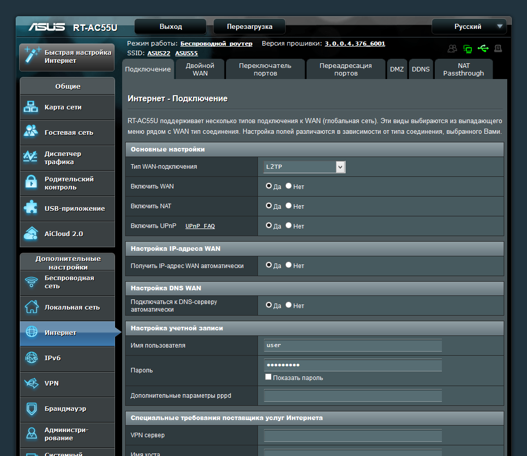 Подключение к интернету поддерживает работу с IPoE, PPPoE, PPTP, L2TP. Есть возможность работы через USB-модемы и режим двойного WAN. В случае использования провайдером динамического адреса пригодится встроенный клиент DDNS с несколькими сервисами, включая собственный сервис Asus. Роутер поддерживает обслуживание некоторых протоколов (в частности SIP и реализации VPN) через NAT. Поддержка IPTV заключается в поддержке IGMP, udpxy и выделения одного или двух физических портов для приставок.