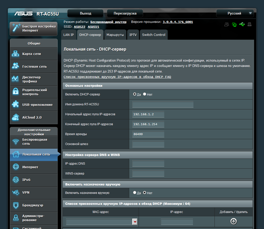 Пользователь может изменить собственный внутренний адрес роутера в сегменте LAN, настроить опции сервера DHCP, в том числе и назначить выдачу постоянного IP требуемым клиентам по MAC-адресам.