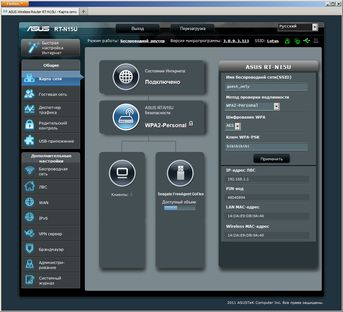 Основная страница интерфейса показывает схему сети — роутер, подключенных клиентов и внешние устройства. В этой же страницы можно изменить некоторые основные настройки устройства, например имя и ключ беспроводной сети. Отметим несколько иконок в верхней части окна. Их можно использовать для включения/отключения интернета, безопасного извлечения USB-накопителей, управления гостевой Wi-Fi сетью. Предусмотрена здесь и программная кнопка для перезагрузки роутера.