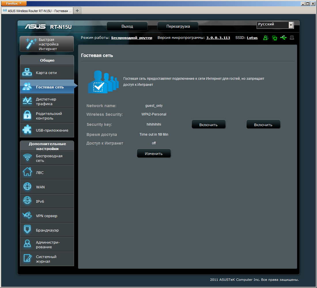 Внешний вид web-интерфейса мало отличается от рассмотренных ранее моделей ASUS. Он имеет перевод на несколько языков, включая русский. Местами встречаются упоминания о двух диапазонах и 450 Мбит/с — наследие старшей модели. Предусмотрена встроенная справочная система, что будет полезно новичкам. Также отметим наличие помощника для базовой настройки устройства. При необходимости можно разрешить доступ к настройкам с порта WAN.
