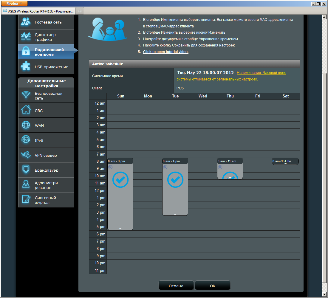 Мы уже встречались в обзорах роутеров с такой функцией, как «Родительский контроль». Но надо понимать, что под одним и тем же названием разные производители могут иметь ввиду разные возможности. В случае ASUS — это установка расписания доступа клиентов к интернету. В правилах указывается MAC-адрес (для правил фильтрации) и имя компьютера (для удобства), для простоты их можно выбрать из списка текущих подключений, и часы доступности интернета в таблице на каждый день недели. Точность при этом составляет один час. В целом получилась удобная функция и при этом независящая от клиента, так что можно использовать ее и с телефонами и планшетами. Правда обходится фильтр тоже достаточно просто — изменением MAC-адреса клиента.
