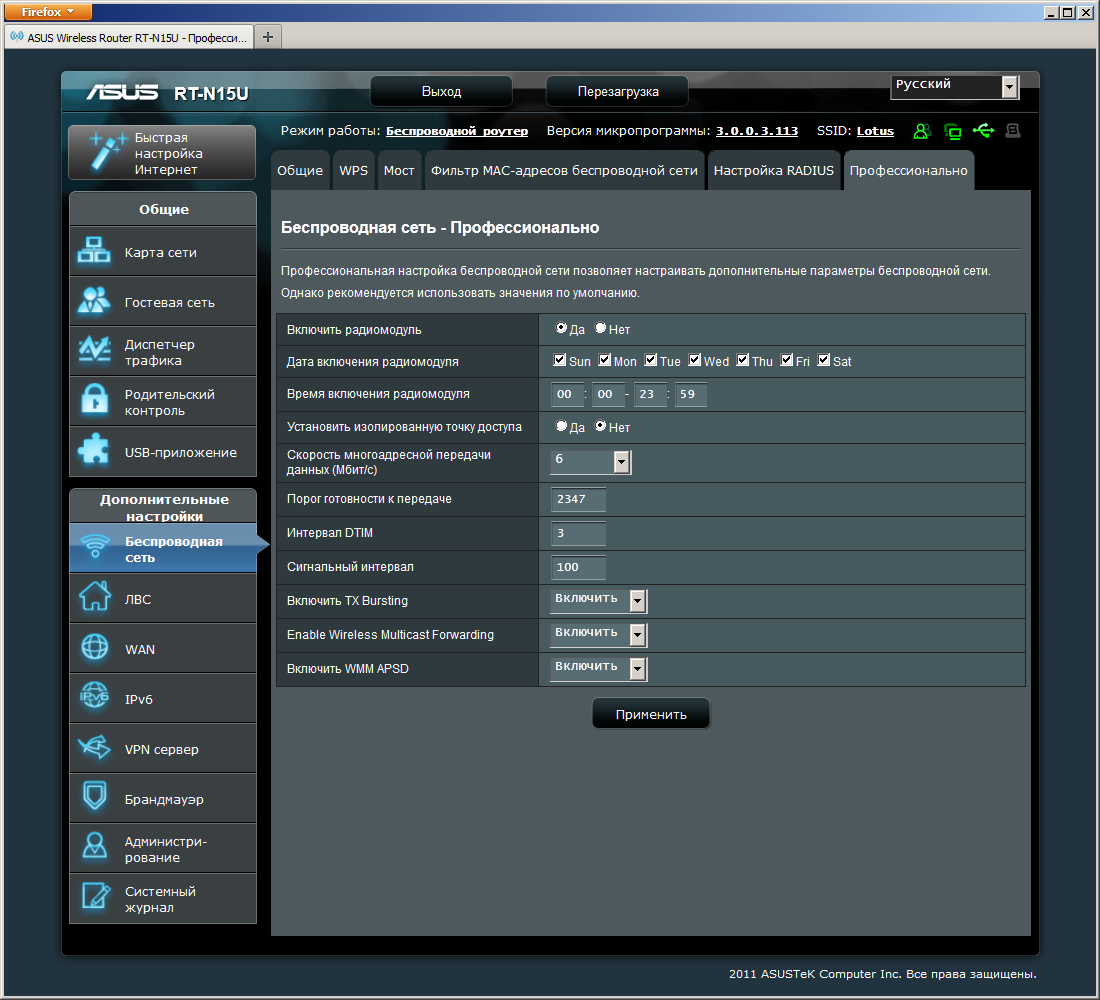 На странице «Профессионально» есть опции выключения беспроводного модуля, установки расписания его работы (один диапазон времени на выбранные дни недели), включения мультикаст-трансляций и некоторые другие параметры.
