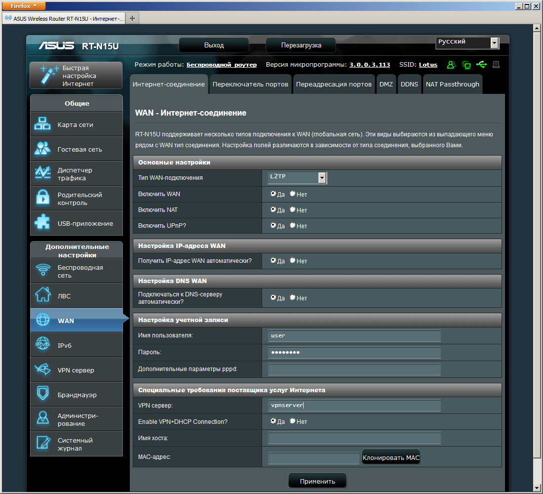 Роутер поддерживает все популярные способы подключения к провайдеру — постоянный или динамический адрес, PPPoE, PPTP и L2TP. Допускается изменение MAC-адреса внешнего интерфейса роутера. Отметим наличие пунктов отключения порта WAN, технологии NAT и протокола UPnP. Присутствует стандартная для ASUS реализация технологий трансляции и переключения портов для обеспечения доступа к сервисам на клиентах в сегменте LAN. Возможно также использование DMZ.