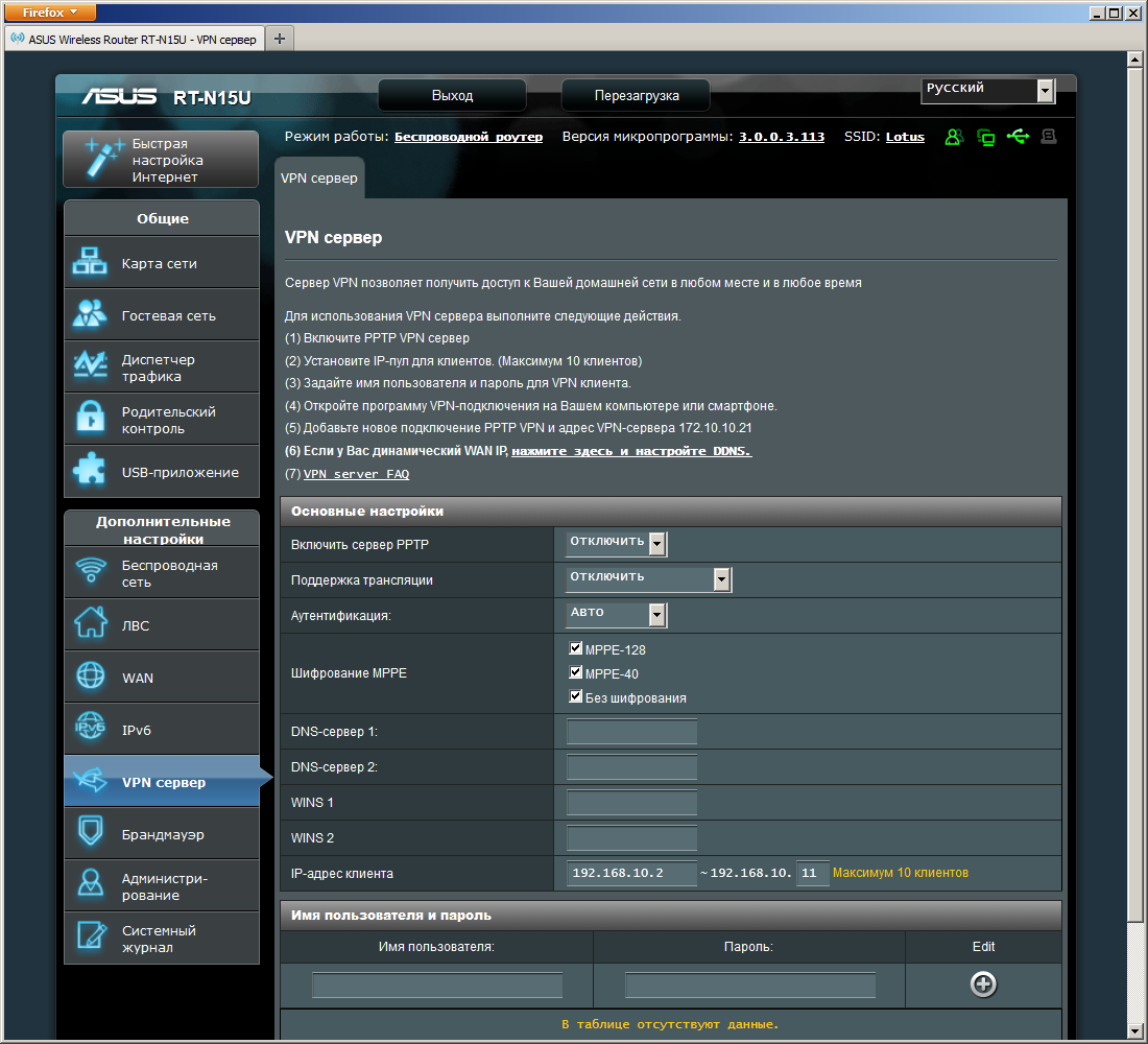 Как и старшие братья, RT-N15U может выступать в качестве сервера PPTP. Это позволит вам получить полный и безопасный удаленный доступ к своей домашней локальной сети.