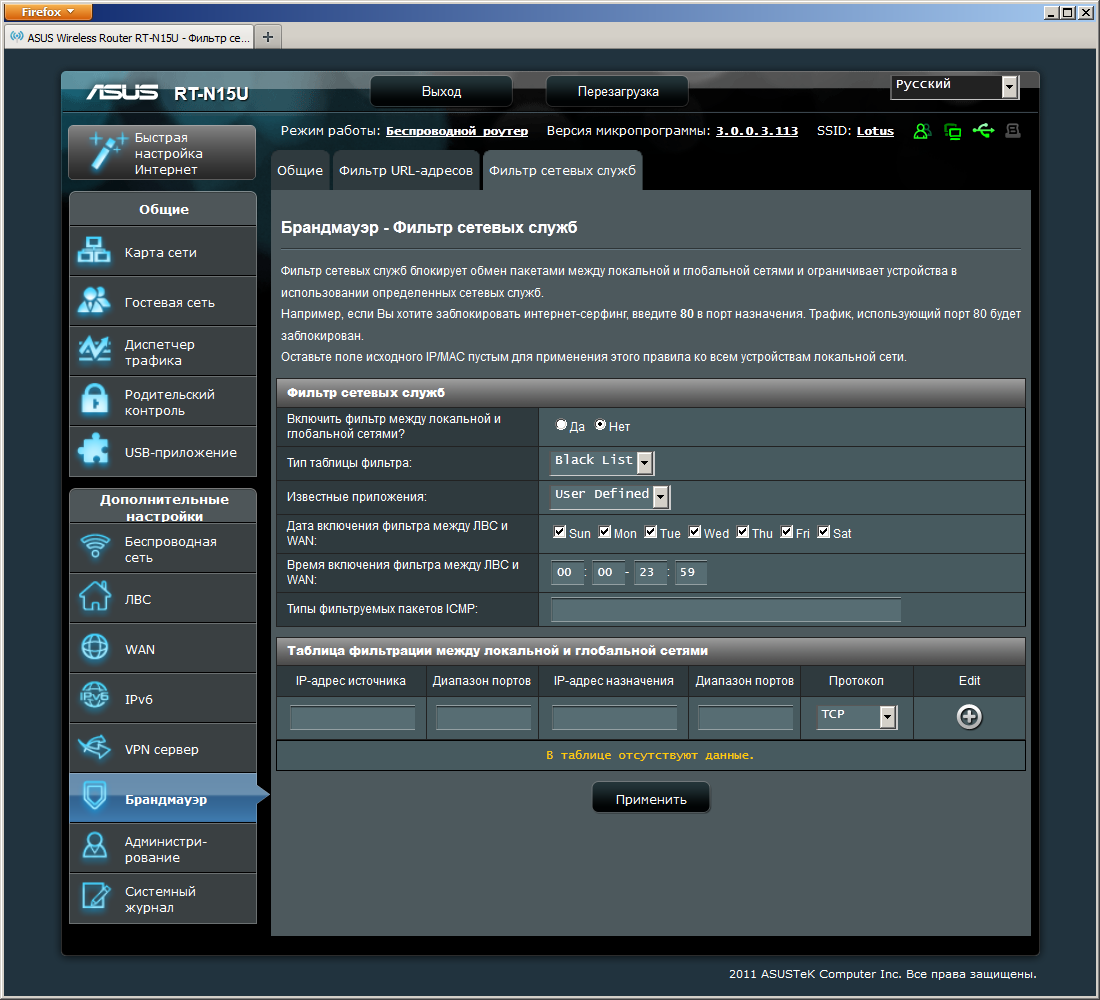 В роутере предусмотрена настройка двух вариантов фильтров — стандартного фильтра по ключевым словам в URL и фильтра пакетов. Во втором случае в правилах указываются адреса и порты источника и получателя и тип протокола. Работают они на направлении LAN-WAN и позволяют запретить доступ к определенным сервисам в интернете. Возможно применение к правилам общего расписания работы (как и для Wi-Fi — один диапазон времени на выбранные дни недели).