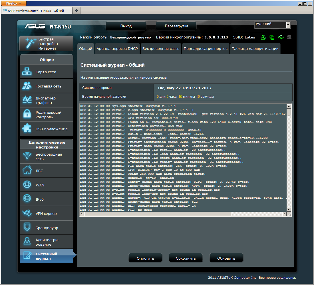 Последняя группа — «Системный журнал» - содержит как стандартный лог встроенного Linux, так и несколько дополнительных информационных страниц. В частности тут предоставлена таблица маршрутизации, список переадресованных портов, выданные DHCP-клиентам адреса, подробности режима точки доступа и подключенные к ней клиенты.