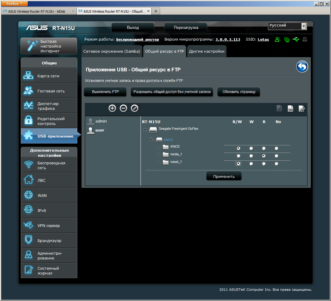 Номера портов изменить нельзя, активация сервера FTP касается сразу и локального доступа и работы через интернет. Для ограничения прав можно запрограммировать пользователей в самом роутере. Общие ресурсы представляют собой папки на разделах. В этом режиме доступа к корневым директориям дисков не будет. Из соображений производительности, по-умолчанию разрешено подключение максимум пяти пользователей одновременно. Для безопасного отключения устройств нужно использовать кнопку в web-интерфейсе.