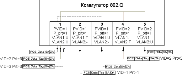 Портам коммутаторов, поддерживающих 802.1Q, и участвующим в формировании ВЛС, назначаются специфические атрибуты. Каждому порту назначается PVID (Port VLAN Identifier) — идентификатор ВЛС для всех приходящих на него немаркированных кадров, и приоритет порта (P_Prt). Коммутатор маркирует каждый приходящий к нему немаркированный кадр (вставляет номер VLAN и приоритет, пересчитывает FCS), а маркированные оставляет без изменений. В результате внутри коммутатора все кадры будут маркированными. Порты могут конфигурироваться как маркированные или немаркированные члены ВЛС. Немаркированный член ВЛС (untagged member) выходящие через него кадры выпускает без тега (удаляя его и снова пересчитывая FCS). Маркированный член ВЛС (tagged member) выпускает все кадры маркированными. Теги берутся либо исходные (когда в коммутатор кадр входил уже маркированным), либо устанавливаются в соответствии PVID и приоритетом порта, откуда этот кадр пришел в коммутатор. Для каждой ВЛС определяется список портов, являющихся ее членами. Порт может быть членом одной или более ВЛС. Маркированный кадр, пришедший на порт с "чужим" для него идентификатором ВЛС, называется незарегистрированным (unregistered) и коммутатором игнорируется. Работу коммутатора 802.1Q иллюстрирует рис. 1. При конфигурировании для каждой ВЛС каждый порт должен быть объявлен как немаркированный (U), маркированный (T) или не являющийся членом данной VLAN (-). Если используется запараллеливание портов (port trunking) или резервирование линий (LinkSafe), то с точки зрения ВЛС запараллеленные порты представляют единое целое.