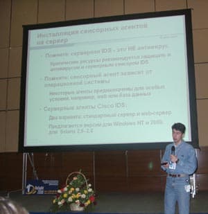 Безусловно, одними из самых посещаемых были сессии Михаила Кадера — в основном они были посвящены проблемам безопасности в корпоративных сетях и, конечно, способам их решения. В числе прочих были рассмотрены вопросы возможностей атак (общего плана) на коммутируемые сети и методы их предотвращения, а так же возможности и использование системы обнаружения вторжений, предлагаемых Cisco Systems, где нам пообещали выход в ближайшее время IDS-устройства, обрабатывающего потоки данных до 1Gbit-а.