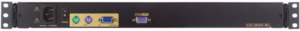 На задней поверхности разъём питания с кнопкой отключения, фирменный разъём D-Sub для подключения сервера или переключателя консоли и стандартные VGA и два PS/2 для внешних монитора, мыши и клавиатуры.