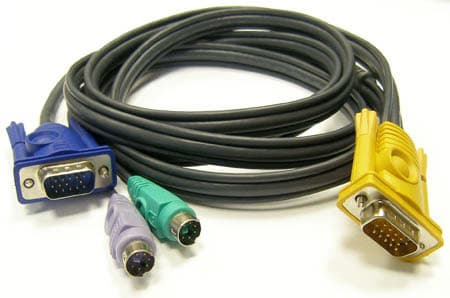Кабель для подключения ПК или KVM с одной стороны содержит фирменный разъём формата D-Sub, а с другой стандартные коннекторы VGA и два PS/2. Три провода объединены изоляцией, толщина средняя. Доступна только одна длина кабеля — 1,8 метра. Выбор из одной позиции небогатый, однако если учесть, что консоль в шкафу обычно располагается рядом с соответствующим переключателем, то для большинства случаев такой длины будет вполне достаточно.