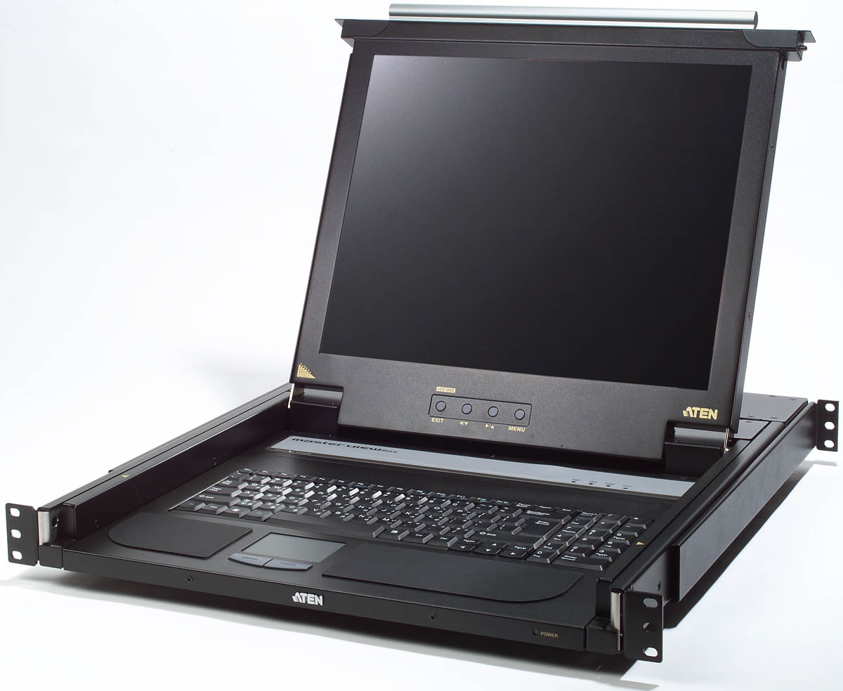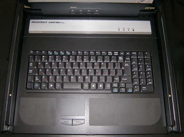 Итак, Master View Max Slideaway Console CL-1200 MRG — устройство для монтажа в стандартную 19” стойку высотой 1U, содержащее 17” ЖК-монитор, клавиатуру с русской раскладкой и тачпад. Предназначено для управления единичным сервером или группой серверов через внешний KVM-переключатель. Оснащено портом для подключения внешнего, работающего параллельно с основным, комплекта из монитора, мыши и клавиатуры (дополнительной внешней консоли).