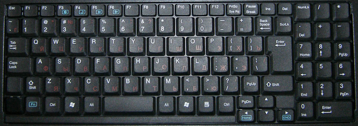 Клавиши плоские, полноразмерные, ход нажатия короткий, менее 2 мм. Нажатие мягкое, информативное. Звук тихий. Механизм возврата клавиш модифицированный купольный, крепление каждой клавиши — на рамку из двух половинок. Дрягаются клавиши совсем немного, даже длинные. Клавиши полноразмерные, кроме большей части верхнего ряда и курсорного блока, эти на треть уменьшены в высоту. Русские буквы тёмно-красные, что есть ЗЛО! Основные символы белые, семь Fn — светло-голубые. Вся маркировка выполнена запрессовкой цветных кусочков пластика, практически вечная.