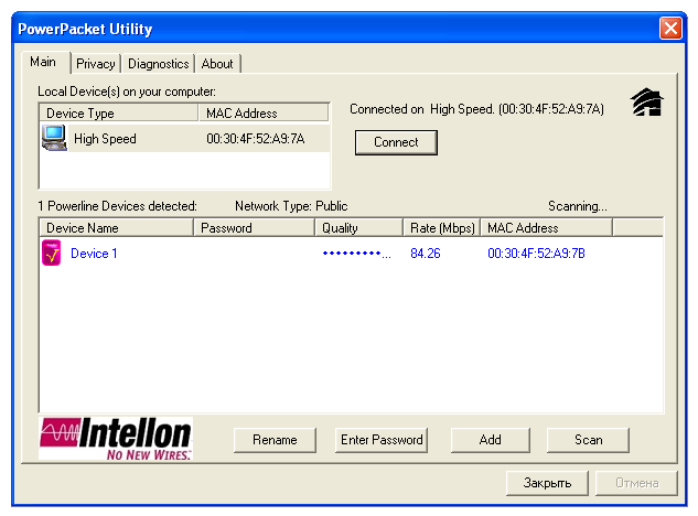 В верхнем окошке отображаются PowerLine-устройства, доступные через Ethernet-сеть. Если кабель от сетевого адаптера компьютера вставлен напрямую в PowerLine-адаптер — в этом окошке может отображаться только одно устройство.