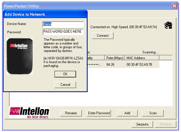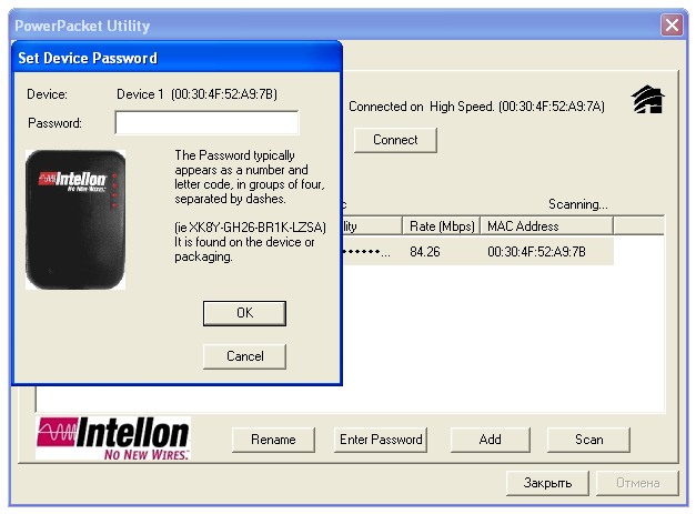 В нижнем окошке отображаются удаленные устройства, доступные по силовой сети, — для изменения настроек удаленных устройств потребуется ввести пароль, указанный на каждом устройстве снизу.