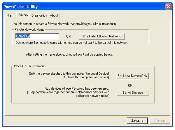 Далее мы задаем имя сети — для связи устройств PowerLine, имя сети должно быть одинаковым на каждом устройстве. Имя сети также исполняет роль предварительного ключа для обеспечения шифрования. Имя сети по-умолчанию «HomePlug» — то есть если вам не важна безопасность сети — можно не настраивать устройство — достаточно просто вставить его в розетку — будет использовано как раз это имя сети.