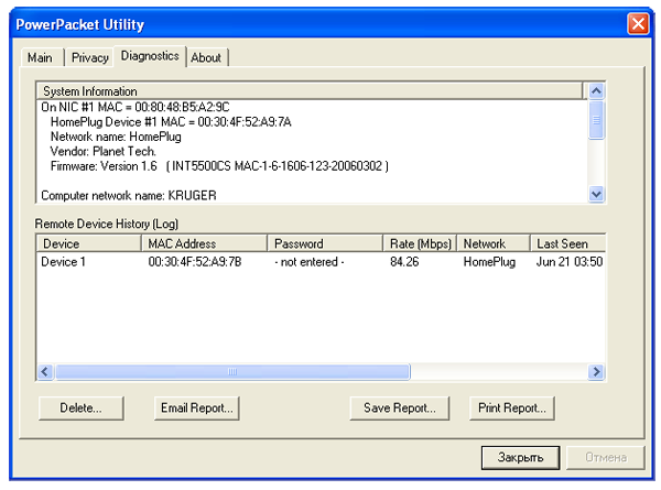 Разрешение вскрывать устройство получено не было (устройство опломбировано), поэтому его содержимое осталось для нас загадкой. Тем не менее, судя по утилите настройки, устройство выполнено на базе одной из микросхем Intellon (устройство TRENDnet, рассмотренное нами в прошлом обзоре также базировалось на микросхеме данного производителя).