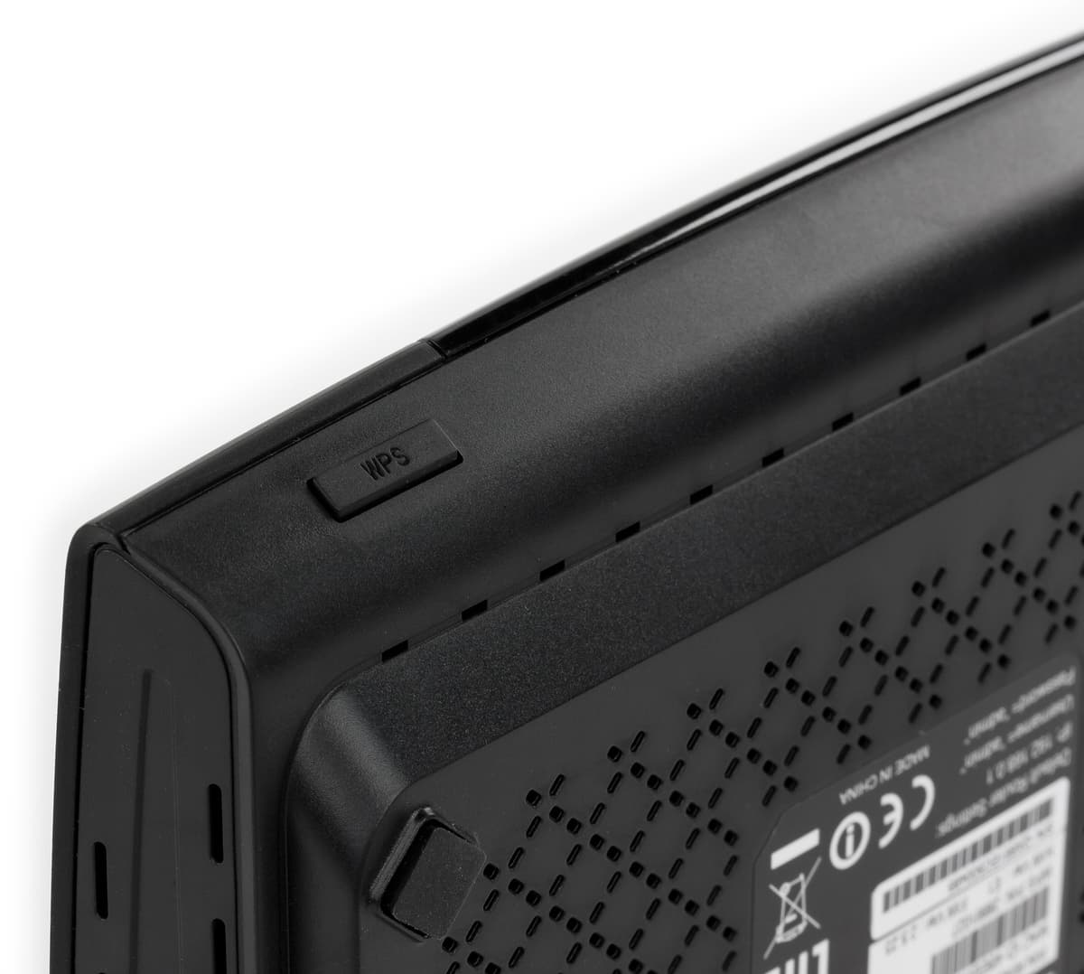 Отметим наличие стандартной наклейки с идентификаторами устройства и информацией по подключению. На скошенном переднем торце расположена достаточно крупная кнопка WPS. Правда для ее использования потребуется удерживать корпус устройства рукой.