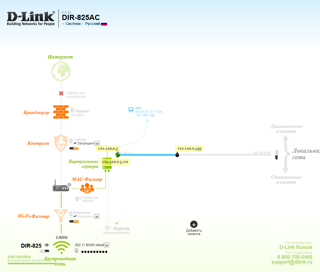 Специальная страница «Мониторинг» показывает графическую схему вашей сети и позволяет перейти к соответствующим настройкам фильтров, межсетевого экрана и другим параметрам.