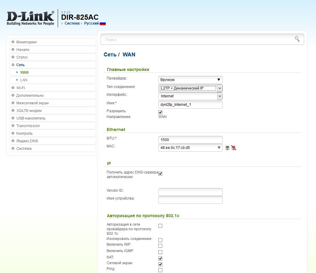 Для работы с интернетом можно использовать проводное подключение, сотовый модем или Wi-Fi. Первый вариант поддерживает IPoE, PPPoE, PPTP, L2TP, имеет возможности работы с сетью оператора при VPN-подключениях, изменение MAC-адреса, регулировки MTU, использование 802.1X. Предусмотрен клиент DDNS с поддержкой двух сервисов — оригинального DynDNS и фирменного варианта D-Link.