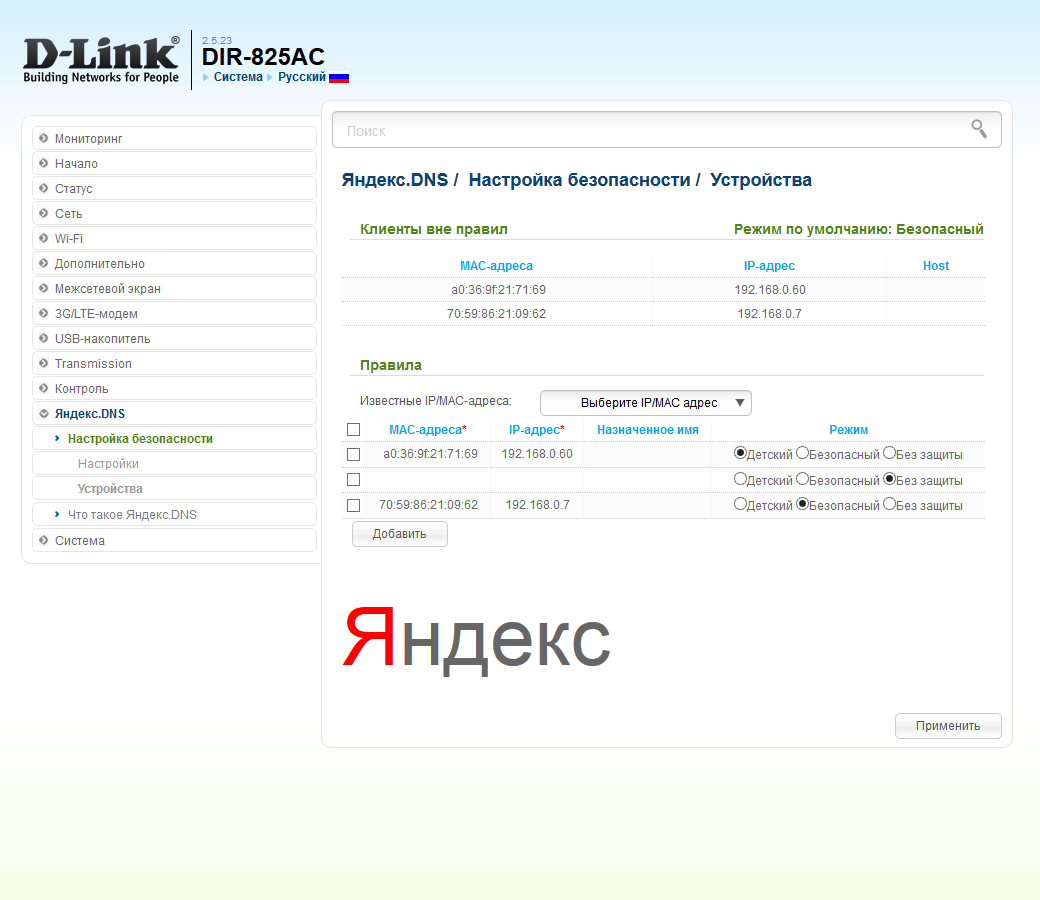Отдельно стоит отметить встроенный клиент сервиса Яндекс.DNS. С распространением мобильных устройств, фильтрация DNS-запросов на роутере является одним из наиболее простых и удобных способов повышения уровня защиты в домашней локальной сети. В рассматриваемом устройстве есть возможность выбора для каждого из клиентов одного из режимов — стандартный, детский или без защиты. Аналогичная настройка есть для установки уровня для всех остальных устройств по умолчанию.