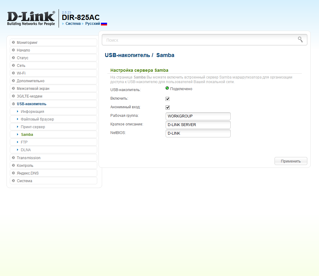 В прошивке есть встроенный сервер DLNA, который может пригодиться для трансляции мультимедиа на совместимые телевизоры. Он поддерживает выбор времени обновления базы и позволяет запрограммировать несколько директорий для файлов с указанием их категории. Индексируются многие современные форматы, включая jpeg, mp3, wma, flac, m4a, avi, ts, mkv, mp4, mpg, wmv и другие.
