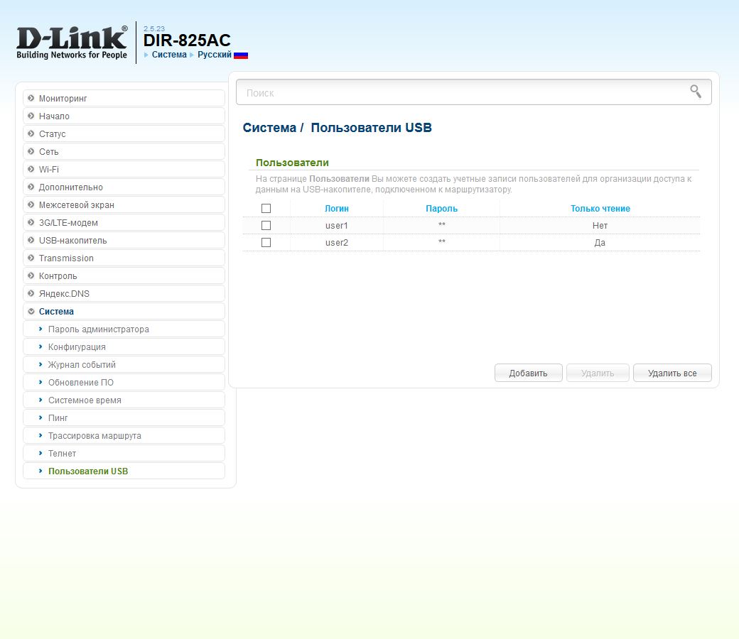 Роутер оборудован портом USB 2.0, что заметно расширяет список его возможностей. В прошивке предусмотрено подключение к порту следующих устройств: накопителей, сотовых модемов 3G/4G и принтеров. При необходимости одновременной работы с несколькими устройствами можно использовать USB-хаб. В этом случае стоит обратить внимание на обеспечение необходимого питания для них. Проверка показала, что вероятно есть ограничение на общее число подключаемых устройств. Больше двух накопителей или модема и накопителя роутер «не видел».